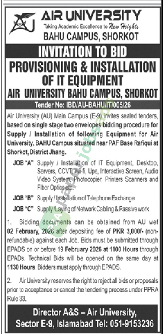 A government tender notice has been issued by AIR UNIVERSITY, Shorkot. The bid submission deadline is 19 February 2026. Originally published in Daily Jang on 1 February 2026.
