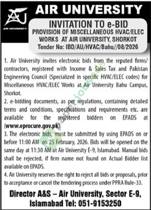 Tender Notice – Provision & Installation of IT Equipment – AIR UNIVERSITY Bahu Campus