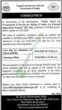 A government tender notice has been issued by Punjab Land Records Authority, Multan. The bid submission deadline is 9 February 2026. Originally published in Daily Jang on 2 February 2026.