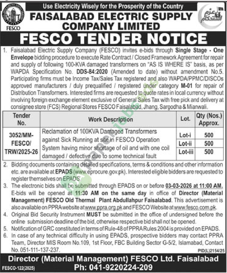 1. Faisalabad Electric Supply Company (FESCO) invites e-bids through Single Stage – One