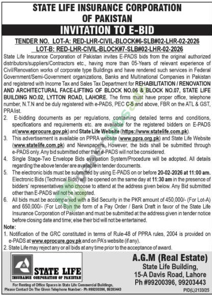 A government tender notice has been issued by STATE LIFE INSURANCE CORPORATION, Lahore. The bid submission deadline is 20 February 2026. Originally published in The Nation on 4 February 2026.