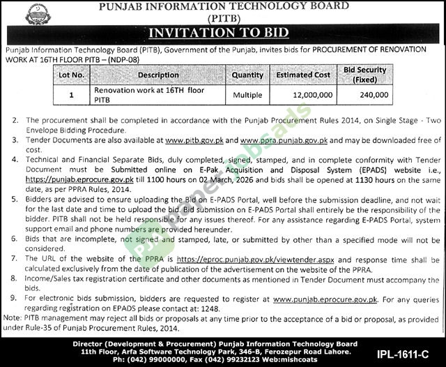 Punjab Information Technology Board (PITB), Government of the Punjab, invites bids for PROCUREMENT OF RENOVATION