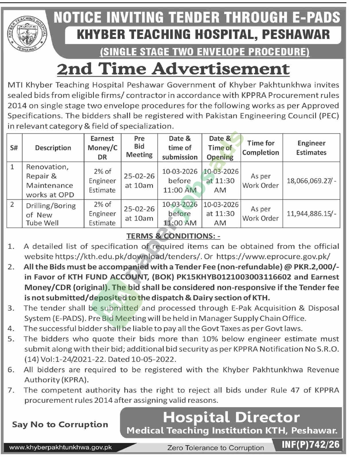 A government tender notice has been issued by KHYBER TEACHING HOSPITAL, Peshawar. The bid submission deadline is 10 March 2026. Originally published in Dawn on 19 February 2026.