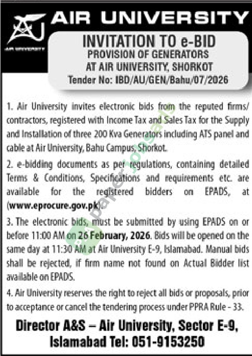 Tender Notice – Provision & Installation of IT Equipment – AIR UNIVERSITY Bahu Campus