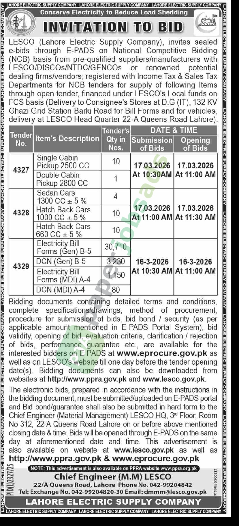 A government tender notice has been issued by LESCO, Lahore. The bid submission deadline is 17 March 2026. Originally published in Dawn on 21 February 2026.