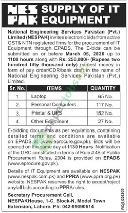 Tender Notice - Supply of IT Equipment - National Engineering Services Pakistan (Pvt.)