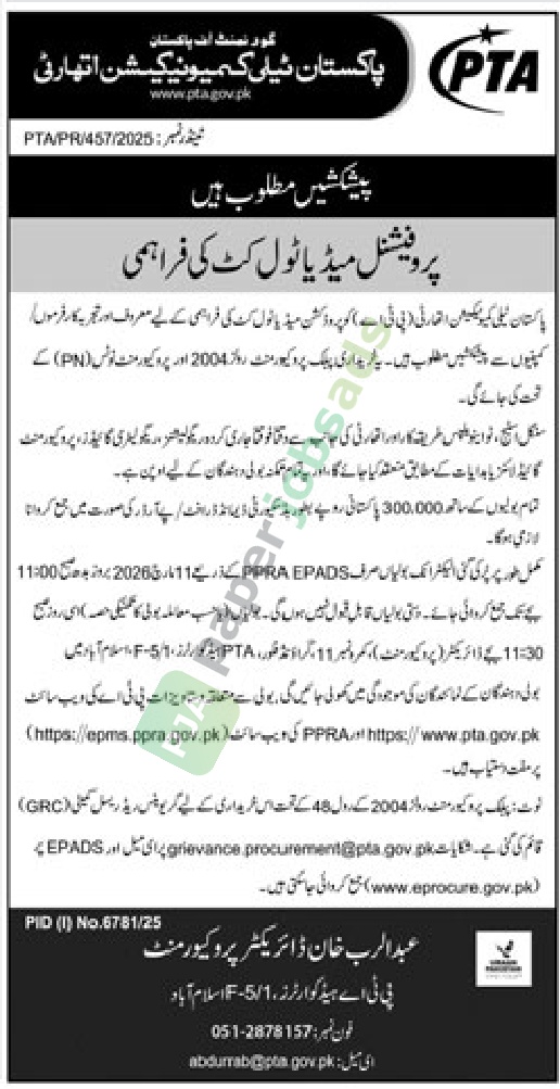 A government tender notice has been issued by : PTAPR457/2025, Islamabad. The bid submission deadline is 11 March 2026. Originally published in Daily Jang on 21 February 2026.