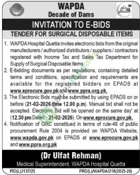 1. WAPDA Hospital Quetta invites electronic bids from the original