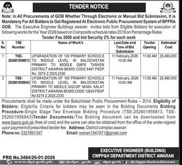 GOB. The Executive Engineer Buildings awaran invites bids from Eligible Bidders for execution of