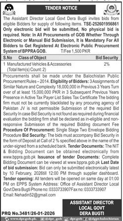 The Assistant Director Local Govt Dera Bugti invites bids from