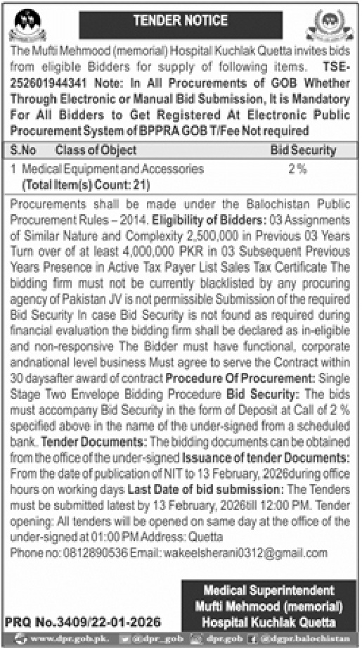 A private tender notice has been issued by The Mufti Mehmood (memorial) Hospital, Quetta. The bid submission deadline is 13 February 2026. Originally published in Daily Jang on 24 January 2026.