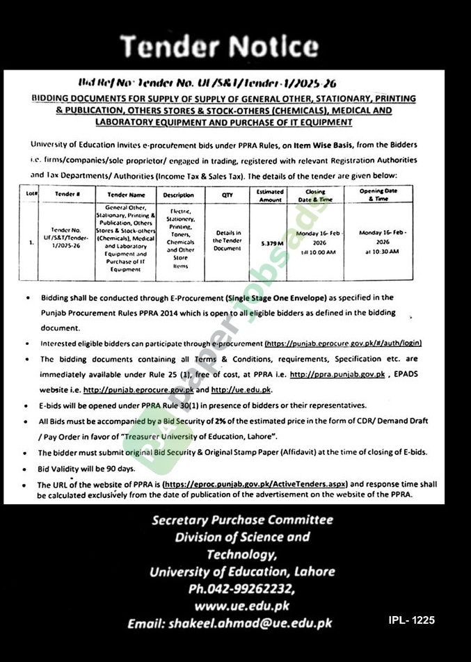 University of Education Invites e-procurement bids under PPRA Rules, on Item Wise Basis, from the Bidders