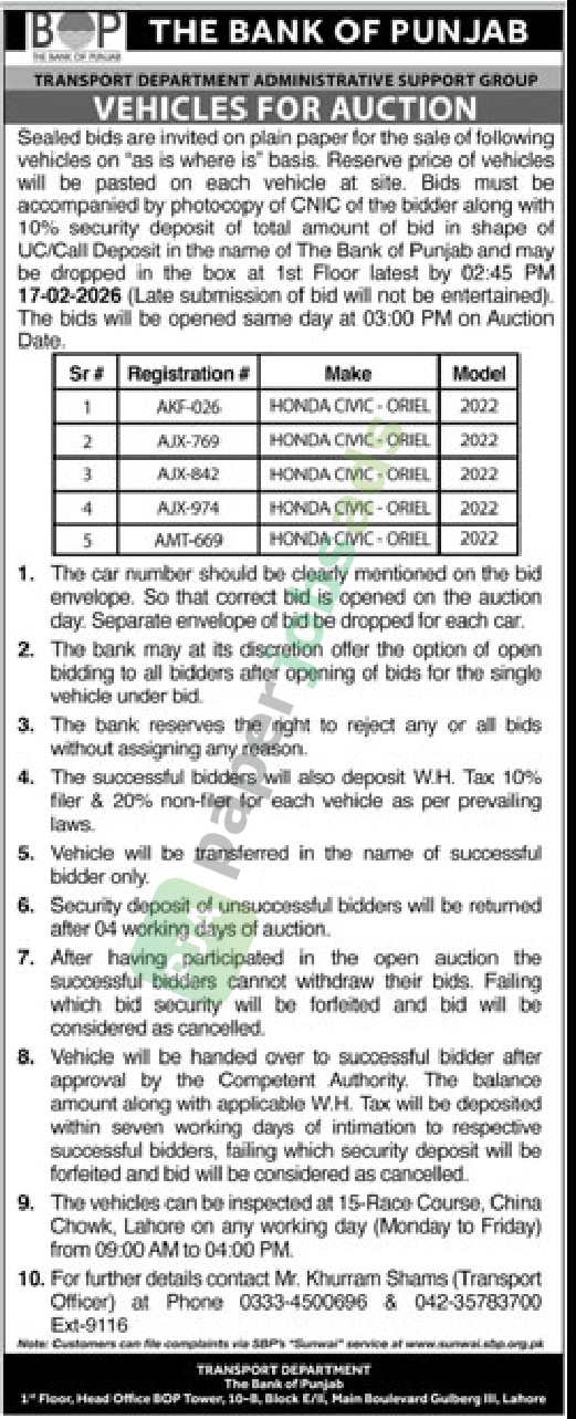 A semi-government tender notice has been issued by BANK OF PUNJAB, Lahore. The bid submission deadline is 17 February 2026. Originally published in Daily Jang on 12 February 2026.