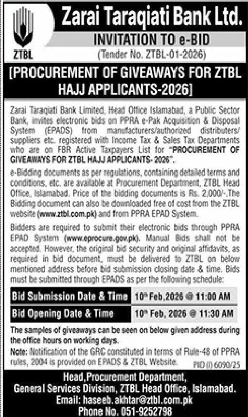 website (www.ztbl.com.pk) and from PPRA EPAD System.