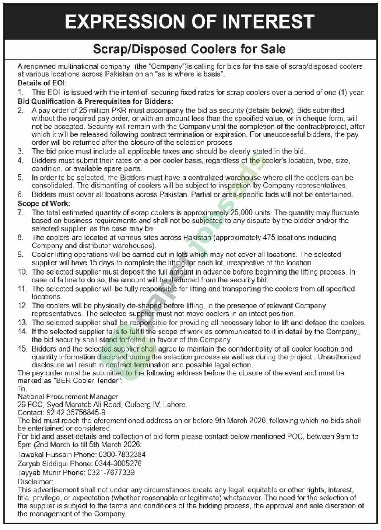 A private tender notice has been issued by A renowned multinational company, Lahore. The bid submission deadline is 9 March 2026. Originally published in Dawn on 1 March 2026.