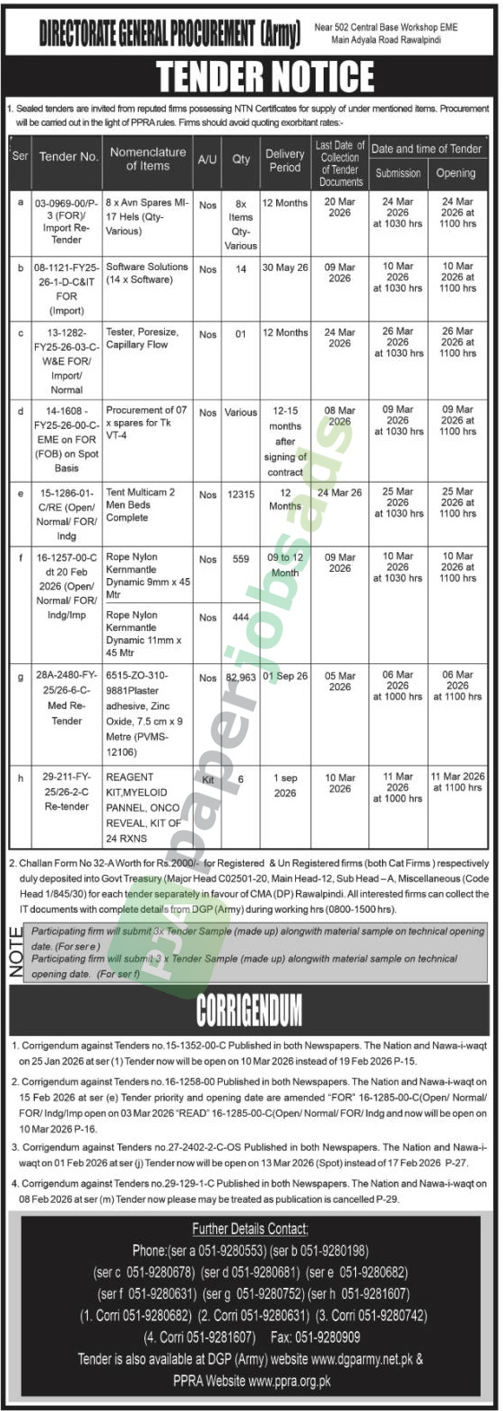 A government tender notice has been issued by DIRECTORATE GENERAL PROCUREMENT (Army), Rawalpindi. The bid submission deadline is 24 March 2026. Originally published in The Nation on 22 February 2026.