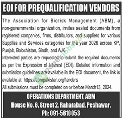 A ngo tender notice has been issued by The Association for Biorisk Management (ABM), Peshawar. The bid submission deadline is 13 March 2026. Originally published in Daily Jang on 25 February 2026.