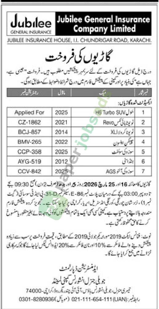 Vehicle for Sale - Jubilee General Insurance Company Limited